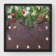 Um relógio com uma fotografia rústica de uma mesa marrom de madeira com pinecones, agulhas de pínus, neve e Enfeites de natal. Festivo e adorável.