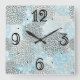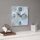 A modern feminine floral pattern in shades of blue and gray with black whimsical clock numbers.