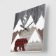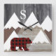 Relógio de parede com um design rústico de montanhas cobertas de neve, uma xadrez/ursinho de búfalos, e personalizado com seu monograma/inicial. Perfeito para sua casa de montanha ou aluguel de férias.