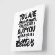 Impressão de lino preto e branco de uma citação motivacional que diz "Você é bom o suficiente, mas você pode sempre ser melhor". Oferece encorajamento às pessoas para saberem que a autoaceitação e o crescimento andam de mãos dadas.