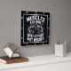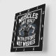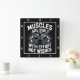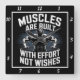 Este relógio de parede preta apresenta o texto "MÚSCULOS SÃO CONSTRUÍDOS COM ESFORÇO NÃO DESEJOS" em uma fonte branca, em negrito e estilizada, com um contorno azul. As palavras são dispostas em torno de um gráfico central de um indivíduo muscular, que parece ser um homem de pele clara, tocando um sino. O fundo tem uma design azul texturizada e de cinza, sugerindo um cenário de ginástica. A design promove o trabalho e o esforço dos duros na construção de músculos.