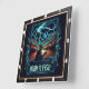 Uma emocionante aventura pesqueira é representada nesta peça artística, com um solteiro em um barco em um lago. O céu está vivo com raios irregulares e nuvens grossas, criando um senso de ação e suspense. O design usa uma poderosa combinação de cores brilhantes, de outro mundo, contra um fundo escuro. O famoso lema "NASCER AO PEIXE" faz parte da trabalho de arte.