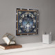 This square wall clock features a highly detailed, dimensional illustration of the Nativity scene centered within an elaborate border. The central motif, set against a dark blue background, shows Mary, Joseph, and the Baby Jesus in the manger, surrounded by other figures. Above them, the text "PEACE ON EARTH" is prominently displayed, flanked by two angels and two white doves. The entire circular scene is framed by a rich blue and gray floral wreath of white lilies and blue berries. The illustration is set within a wide, dark outer wood-look frame, which is simulated using high-detail artwork and is not real wood.
