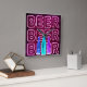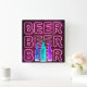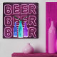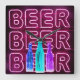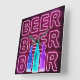 Square wall clock printed with neon look bar sign. The design has colored beer bottles and is lettered with the word BEER in LED strip lighting.