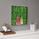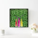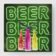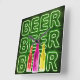 Relógio de parede quadrado impresso com sinal de bar de aparência neon. O design tem garrafas coloridas de cerveja e é escrito com a palavra BEER em LED strip-luz. Tem uma paleta colorida de verde, vermelho, rosa e amarelo. Navegue na nossa loja para procurar alternativos.