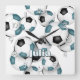 Este relógio de parede temático do futebol apresenta a imagem de um cluster de bolas de futebol preto e branco de tamanho variado - personalizar com o nome do atleta - por katz_d_zynes