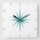 Este relógio quadrado moderno de meio século apresenta uma arrojada explosão atômica azul-turquesa e números correspondentes, o que fará uma fantástica adição às paredes de sua casa ou escritório!