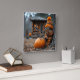 Esse esquilo solitário está tendo um banquete secreto de noz durante a temporada de queda da floresta, uma pequena abóbora laranja com o corte superior aberto, revela ainda mais dentro de loucos. O chão está coberto de folhas caídas e escombros. Esta cena simples evoca uma atmosfera quente, aconchegante e balbuciosa de outono.