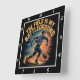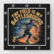 Este relógio de parede preta apresenta o texto "O CAMPO É A MINHA BATTLEGROUND" em uma fonte estilizada amarela curvando em torno de um gráfico central. O gráfico retrata um jogador de futebol, que parece ser um homem de pele clara com cabelo escuro, correndo com uma bola de futebol. O fundo tem explosões dinâmicas de azul e laranja, sugerindo energia e competição no campo.