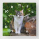 Um gato se senta no jardim verde, próximo a um tronco e olha à frente