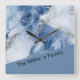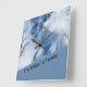 Um relógio de parede quadrado em cores líquidas azul escuro, branco e azul claro, mármore. A design é um sonhador design romântico e elegante, com vestígios de ouro e prata como os nadadores costeiros de brisa do mar. Parece uma textura de pedra abstrato marmor e lava fluida ao mesmo tempo. Você pode personalizar o relógio de parede com seu toque pessoal como seu nome ou monogramas. Este design é perfeito nas casas costeiras e faz a brisa entrar no seu quarto.