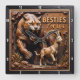 This dramatic square wall clock features a highly dimensional, close-up illustration of a brown panther (or leopard) and a white, happy goat standing side-by-side. The entire design is rendered in muted brown, tan, and dark leather-like tones, strongly suggesting a deep sculpted relief or Sculpted Leather Look. The panther has textured spots and is positioned on the left, while the goat is on the right, smiling with large horns. The background features detailed brown mountains and stylized trees carved behind the animals. The entire foreground is textured, resembling carved rocks and foliage. The large, three-dimensional embossed text "BESTIES FOR LIFE" is carved across the top center in a bold, golden serif font. The clock face features a simple clock face border with large, white, numbered tick marks (1 to 12) integrated into the outer frame. The artwork is surrounded by a thick, dark brown decorative border that resembles a black wood frame.