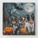 Libere o espírito assustador com esta design sombria do Dia das Bruxas apresentando um bando de cachorros sob um céu escuro e iluminado, cercado por morcegos voadores e abóboras brilhantes. Perfeito para aqueles que amam um toque de diversão terrível com seus amigos peludos!