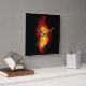 Pena de pavão brilhante feita de fogo e chamas sobre fundo negro.