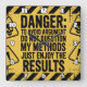 Este sinal de aviso ousado e humorístico apresenta "PERIGO:" no topo de um fundo amarelo angustiado com faixas de perigo pretas. A mensagem assertiva diz: "TO EVOID ARGUMENT / DO NOT QUESTIONY / MY MÉTODOS / SOMENTE GOSTA DO / RESULTS" em letras negras estendidas. Os triângulos de aviso do crânio e do ponto de exclamação reforçam o seu apelo sem disparate e ousado.