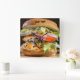Personalized hamburger photo wall clock. Replace the photo with one of your own or keep the hamburger image. Add your own text, top center, or clear the text field for no text.