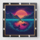 Esta ilustração apresenta um fundo de couro néon colorido de ferramentas escuras com um homem pescando num barco num lago. A cena é posta ao pôr do sol, com tons cor de laranja quente e amarelo contrastando com os tons azuis e verdes legal do lago e das montanhas. A textura estilizada e gravada cria uma impressão única e artística. As aves voam no céu, e os peixes são visíveis na água, somando-se à atmosfera serena ainda detalhada.