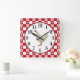 Relógio de parede acrílica de 10,75" x 10,75" com uma imagem de um tabuleiro vermelho, rosa e branco, acentuado com frangos brancos e galos, reminiscente de uma toalha de piquenique country. A face de relógio branco redonda fácil de ler tem borda vermelha e imagem de um frango de limão. Veja toda a coleção This & That Clock (Este e aquele relógio) na seção HOME.