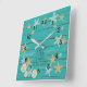 Personalize sua casa de decoração costeira ou casa de férias com esse relógio de parede temático da praia. Sua escolha de redondo ou quadrado. Impresso com um padrão de pranchas de madeira rústicas em sotaques azul-turquesa e de peixe-estrela. Edite o texto se desejar. Veja muitos outros itens de coordenação nesta coleção "Beach Stripes and Starfish" no Camp_and_Cottage no Zazzle.