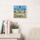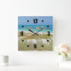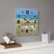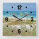 ESTE RELÓGIO DE PAREDE QUADRADO APRESENTA UMA CENA QUE O TRANSPORTA PARA A PRAIA COM A SUA AREIA BRANCA, AVANÇANDO A GRAMA DO MAR E A ÁGUA COM COR AQUAMARINA ABAIXO DE UM CÉU AZUL. EXCELENTE PARA A PRAIA OU CASA DO LAGO!