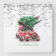 Carro vermelho adorável, pinheiro com neve, e confete prateado sobre fundo branco.
