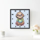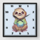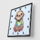 Um relógio com uma ilustração adorável apresentando uma preguiça de aparência feliz vestindo uma camiseta verde. Sentada de pernas cruzadas em uma pose relaxada de meditação.