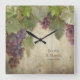 Corresponder ao relógio da parede do decoro que é personalizado com os nomes da noiva e do noivo e a data do casamento faz um maravilhoso presente de Chá de panela, presentes de casamento ou de casa-de-banho para o seu casal favorito. Combina com o design de ilustração do Cartão de Convite de Papel Quadrado, ideal para casamentos no estilo exterior de Verão, Outono ou Queda de Vineyard, em um local de adega. Lindas uvas de vinho tinto e suas folhas são obras de arte originais pintadas manualmente por Audrey Jeanne Roberts. Eles foram colocados sobre um fundo de conselho de cerca de madeira quente, vestida e aflita, que é antiquado com textura de excelente e sutis elementos de rolagem decorativa da impressora de ornamentação que acrescentam um toque de elegância. A mistura perfeita de um tema formal e confortável, elegante e de tendências, mas um eterno clássico de coleção de convites para casamento que será tão bonito quando você olhar para seu vigésimo quinto aniversário! Há um convite completo para o casamento, com produtos coordenadores para chás de panela, chás casais, jantas de ensaio, cerimônias e recepções de casamento.