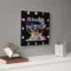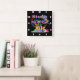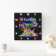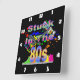 Relógio de parede em acrílico preto de 10,75" x 10,75" com uma imagem de placas de tinta vermelha, laranja, amarela, verde e azul, tênis de topo em cores neonatais, fitas cassetes, óculos escuros coloridos e o texto "Preso nos anos 80" em letras neonatais. Cara branca de relógio fácil de ler.