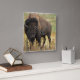 Bisonte de madeira em um grande campo com gramas altas.