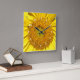 Feche acima da foto da multidão de florets no centro do girassol amarelo brilhante. Os círculos geométricos centrais das "sementes" são a base das mãos de pulso de disparo. Os numerais brancos estão na borda exterior perto das pétalas amarelas. Uma mosca está consultando perto do número 10.