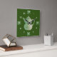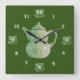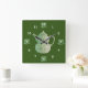 O bule e os copos indicam o momento correto para o chá. Imagem central do bule cerâmico verde pálido cercado pelos numerais brancos. Os copos cerâmicos sentam-se atrás das 12, 3, 6, e 9 posições. Fundo em verde escuro. Arte cerâmica original por Nora Chen.