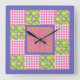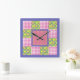 Um relógio de parede quadrado bonito, decorado com um padrão falso de primatas cor-de-rosa profundo, azuis violeta e amarelas sobre um fundo verde folha de fundo, com gingham e bolinhas; cor-de-rosa e branco profundos, da coleção "Primroses" Posh & Painterly.