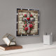 seu encantador relógio de parede quadrada apresenta uma cruz rustica de madeira enfeitada com um coração vermelho proeminente em seu centro e corações menores ao longo de seu feixe vertical. Está cercado por rosas vermelhas vibrantes e delicadas rosebudas, colocadas contra um fundo de madeira angustiado, simbolizando o amor divino e a devoção espiritual.