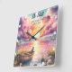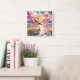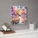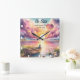 Este relógio de sereno quadrado exibe uma cena de lago tranquila no pôr do sol, com nuvens roxas e cor-de-rosa suaves refletindo sobre a água. Um pequeno barco de madeira descansa pela costa, com uma ave azul. O inspirador texto "Fique e saiba que sou Deus" acrescenta um toque espiritual pacífico e reflexivo a esta bela paisagem natural.