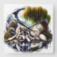 Abaixo de uma lua de cheio luminosa, um lobo majestoso está reposando sob o abrigo de um salgueiro chorão. A cena é perfeitamente espelhada na superfície vívida de um lago tranquilo, convidando um momento de reflexão e paz no abraço da noite.