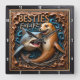 This highly dimensional square wall clock features a bold illustration of a gray shark with an open, toothy mouth and a happy, smiling orange-brown seal swimming together. The entire design is rendered in muted brown, blue, and tan tones, strongly suggesting a deep carved relief or Engraved Wood Look, despite the aquatic subject. The shark is partially concealed by the seal, and the background is a mix of swirling dark blue water and intricate brown coral or tree roots. The composition emphasizes the contrast between the fearsome shark and the cheerful seal. The large, three-dimensional embossed text "BESTIES For LIFE" is carved across the top. The clock face features a simple clock face border with large, white, numbered tick marks (1 to 12) integrated into the outer frame. The artwork is surrounded by a thick, dark brown decorative border that resembles a black wood frame.
