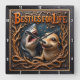This highly dimensional square wall clock features a bold illustration of a large gray shark with sharp teeth and a happy, smiling brown seal swimming in a dark blue, bubbly water background. The entire design is rendered in vibrant orange, brown, and dark blue tones, suggesting a deep carved relief or Engraved Wood Look, despite the aquatic subject. The shark is menacing, while the seal appears cheerful, creating a visual contrast. They are framed by an elaborate circular wreath of gnarled, orange-brown tree roots or coral. The carving style gives the entire image a strong three-dimensional, sculpted quality. The large, three-dimensional embossed text "BESTIES FOR LIFE" is carved across the top. The clock face features a simple clock face border with large, white, numbered tick marks (1 to 12) integrated into the outer frame. The artwork is surrounded by a thick, dark brown decorative border that resembles a black wood frame.