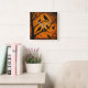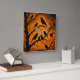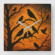 Arte com silhuetas de pássaros escuros sobre um fundo laranja brilhante. Uma obra de arte impressionante e atmosférica que evoca a beleza misteriosa e nítida de uma noite de final de outono. Silhuetas negras ousadas de vários pássaros, provavelmente corvos e gralhas, pousam e voam entre os ramos escuros e esqueléticos de uma árvore árida, tudo isso contra um céu crepuscular intenso e flamejante. Perfeito para quem procura adicionar um toque de intensidade dramática e presença inspirada na natureza durante todo o ano. Combina bem com estilos de interiores rústicos, góticos ou boêmios.
