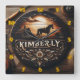 Uma placa de madeira artesanal apresenta uma silhueta de cavalo com elementos do país, com o nome Kimberly em ornamentado contra um pano de fundo do pôr do sol.