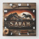 Um cartaz de madeira bem trabalhado mostra o nome Sarah, com uma silhueta de cavalo e um celeiro contra um fundo solar vibrante.