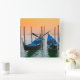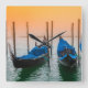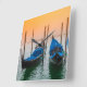 Um cenário pacífico ao lado do Palácio do Cachorro em Veneza, Itália, com quatro gondolas, todos juntos apontando para um belo pôr do sol.