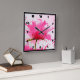 Flor bonito com pétalas cor-de-rosa explodindo em pinturas cor-de-rosa em uma grande parede branca atrás. Grandes gotas de tinta são pulverizadas e espalhadas por toda parte. Design moderna abstrato moderna e legal.