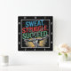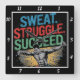 Este relógio de parede preta apresenta o texto "SWEAT. LUTA. SUCEDIDO." empilhado verticalmente em uma fonte em negrito, ligeiramente angustiada com cores azul, vermelha e verde. Abaixo do texto está um gráfico de um indivíduo muscular, que parece ser um homem de pele clara com cabelo escuro curto, realizando um exercício de exercício de rua, possivelmente em bares paralelos. O fundo tem linhas dinâmicas e gotas de água, enfatizando esforço e conquista.