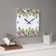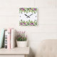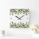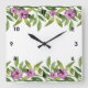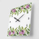 Relógio Quadrado Terra de aquarela com verde e flores roxas