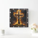 This incredibly powerful and inspiring design captures the theme of Divine Strength through unwavering faith. The artwork features a massive, dark Cross with a detailed central medallion, standing firmly on a rocky base and dramatically enveloped in brilliant, golden-orange flames and towering smoke clouds. A prominent clock motif with dark hands overlays the scene, reminding the observer of the eternal nature of this strength and the enduring power of faith. The design is presented with a high-quality, durable print that creates the striking illusion of a rich, dark wood grain frame surrounding the image, though this border is entirely a visual effect printed directly onto the clock face and is not a separate frame or real wood. The image contains the powerful Bible verse, "I can do all things through Christ who strengthens me. Philippians 4:13." This piece is a final, powerful reminder of Christian conviction.