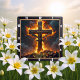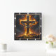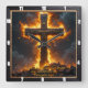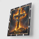 This incredibly powerful and inspiring design captures the theme of Divine Strength through unwavering faith. The artwork features a massive, dark Cross inscribed with "THE CROSS," standing on a rough, rocky base and dramatically enveloped in brilliant, golden-orange flames and dark smoke, symbolizing the solid foundation of belief that overcomes trials. A prominent clock motif with dark hands overlays the scene, reminding the observer of the eternal nature of this strength and the enduring power of faith. The design is presented with a high-quality, durable print that creates the striking illusion of a rich, dark wood grain frame surrounding the image, though this border is entirely a visual effect printed directly onto the clock face and is not a separate frame or real wood. The image contains the powerful Bible verse, "I can do all things through Christ who strengthens me. Philippians 4:13." This piece is a powerful reminder of Christian conviction.
