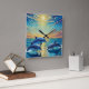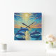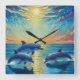 Three dolphins jump over the sea. The sun is shining. Multi-colored clouds run across the sky.