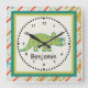 Personalize este relógio colorido de parede quadrada com tricerotops bonitos para um quarto especial de criança. Basta editar seu nome no editor de texto fácil do Zazzle com uma etapa simples. Criado em acentos de cor verde, verde, laranja e preto.