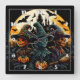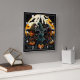 Três espantalhos brancos com chapéus coloridos e abóboras esculpidas ficam contra um pano de fundo assombroso de morcegos e um castelo, capturando a essência da noite de Halloween.