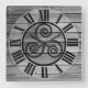 Uma imagem antiga de um triskelion. Acredita-se que um triskelion seja um símbolo antigo de crenças pré-celtas e celtas. A espiral tripla aparece em várias formas na arte pré-celta e celta, com os primeiros exemplares esculpidos em monumentos de pedra pré-celta, que é o que a imagem desse produto representa. Montado numa imagem de tábuas de madeira envelhecidas. Os algarismos negros romanos realçam o tempo, com os números definidos em uma imagem branca transparente.